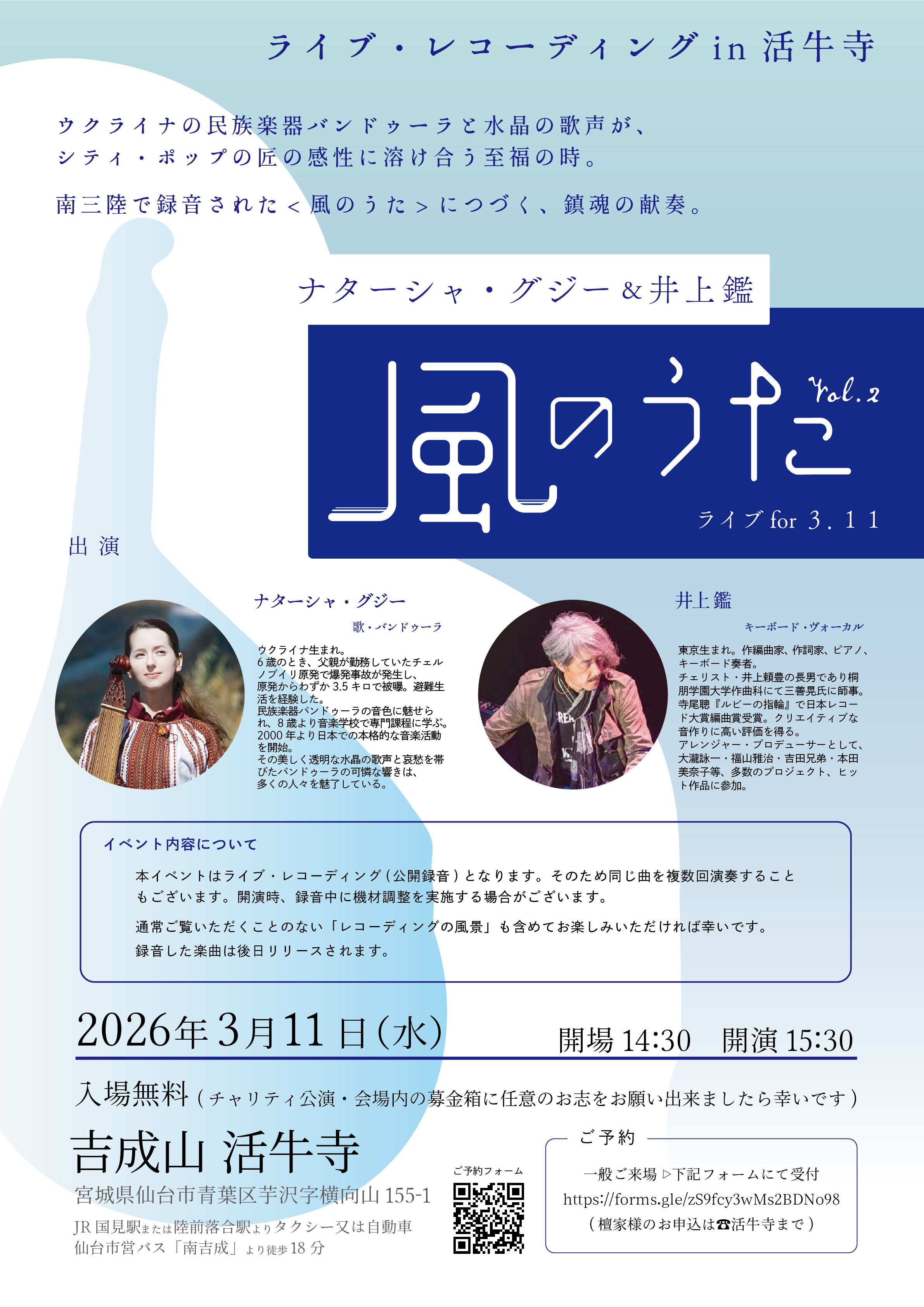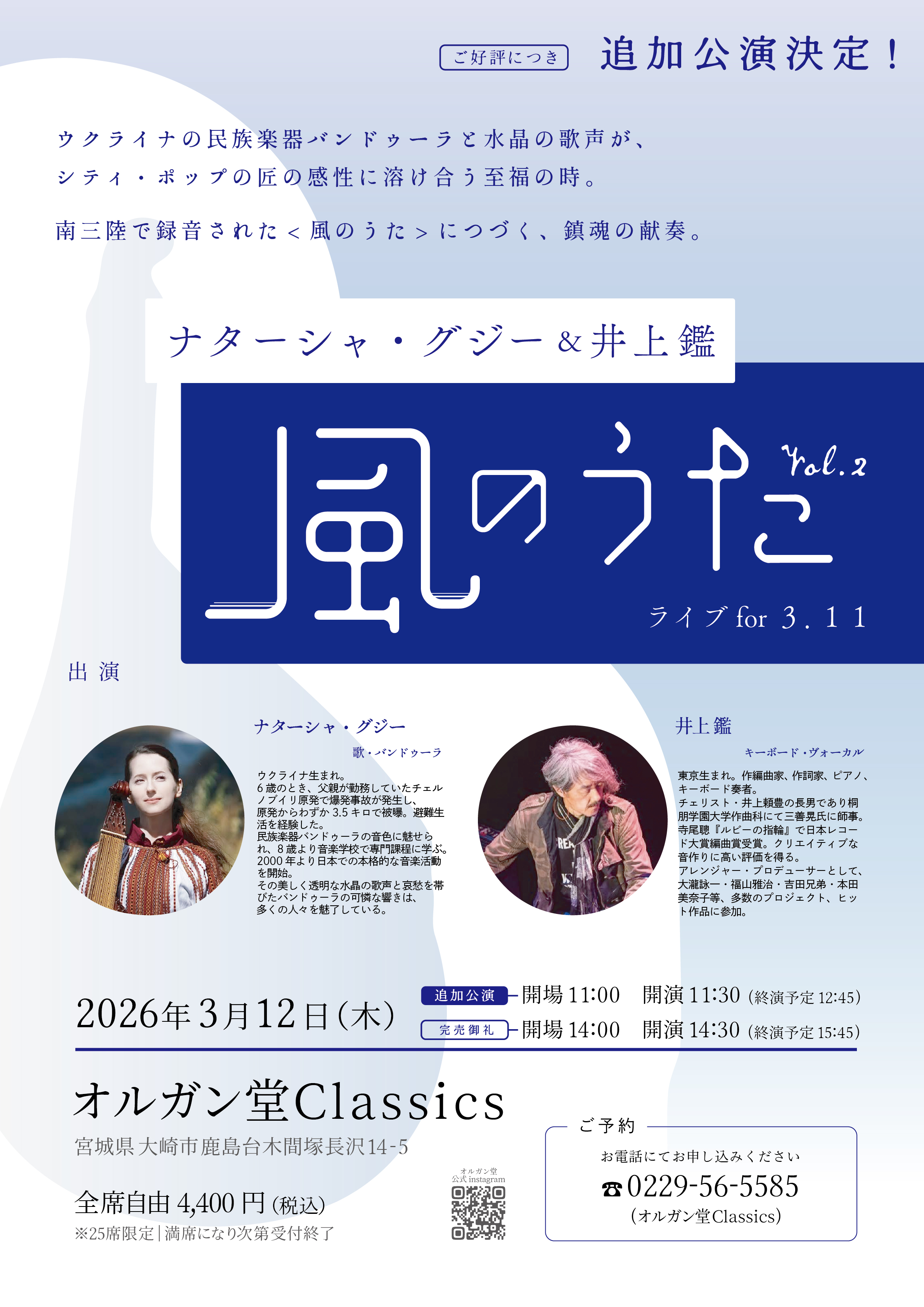 宮城県南三陸町で録音されたアルバム「風のうた」の続編となるライブ&レコーディングツアー、「風のうた vol.2」。バンドウーラ奏者・歌手のナターシャ・グジーとのDUOでコンサートを開催いたします。